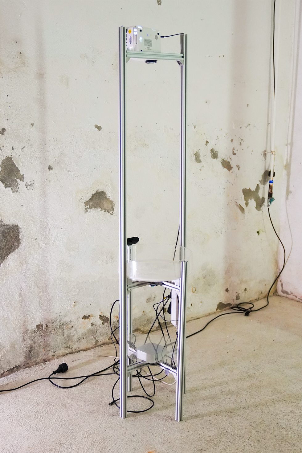 The work stages an encounter between the viewer and a circular basin of water, framed by a minimal vertical aluminum structure. A camera captures the participant’s reflection in the water, and this visual input generates sound in real time. The image becomes unstable, fluid, and distorted, transforming the mirror into a living surface.
